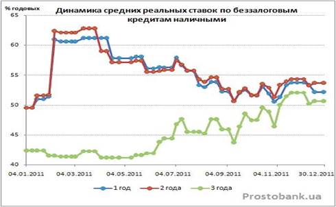 В отличие от одно- и двухлетних кредитов, средние реальные ставки по трехлетним беззалоговым займам до середины 2011 года оставались практически на одном и том же уровне (41,5% - 42% годовых), без значительных изменений. Но с июня-2011 ставки пошли в рост и в ноябре-2011 пересекли отметку в 52% годовых. Правда, до конца года средняя ставка по трехлетним кредитам наличными немного снизилась, но все равно осталась выше уровня 50% годовых.