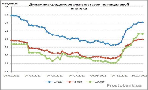 Средние ставки по нецелевой ипотеке, наоборот, вполне точно отображали изменение ситуации на кредитном рынке в 2011 году, снижаясь до октября-2011, и резко увеличиваясь в последнем квартале прошедшего года. В итоге, на конец декабря-2011 средняя реальная ставка по потребительским ипотечным кредитам сроком на год была примерно на процентный пункт ниже своего уровня начала года, и составляла 24% годовых. Средняя ставка по кредитам на пять лет к концу декабря-2011 вернулась к своему уровню начала года – около 22% годовых. А кредиты на десять лет по сравнению с началом 2011 года, наоборот, подорожали примерно на один процентный пункт – до 22,6% годовых.