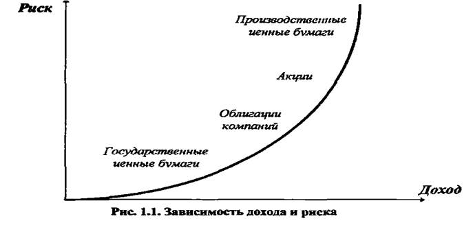 По уровню риска виды ценных бумаг располагаются следующим образом исходя из принципа: чем выше доходность, тем выше риск, и чем выше гарантированность ценной бумаги, тем ниже риск (рис. 1.1.).