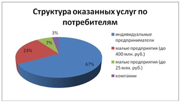 Основные потребители кредитных ресурсов это индивидуальные предприниматели, малые предприятия с доходом до 400 млн. руб. в год, малые предприятия с доходом до 25 млн. руб. в год и компании с доходом до 1 млрд. руб. в год. Структура оказанных услуг по потребителям представлена на рисунке 2.