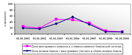 Другим важнейшим показателем структурных особенностей развития банковского сектора страны является доля иностранного участия в капитале банковской системы. На протяжении 2001-2003 гг. наблюдалась устойчивая динамика роста, как доли иностранного капитала в совокупном уставном капитале банковской системы, так и удельного веса активов таких банков в общих активах сектора. Однако в последние годы показатели иностранного присутствия значительно сократились, как показано на рисунке 2.