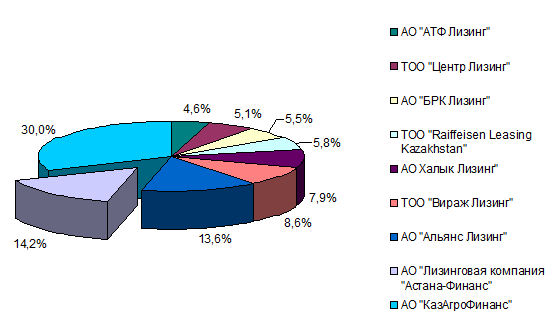 АО "Лизинговая компания "Астана-Финанс" является одним из крупных игроков на рынке лизинга и занимает одну из лидирующих позиций - доля Лизинговой компании составляет 14,2% (рисунок 15).