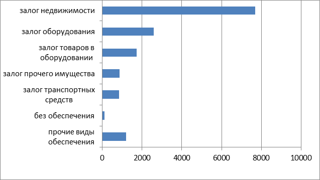Из рисунка видно, что наибольший рост достигнут по кредитам под залог недвижимости на 7680 млн. руб. (45,12%), под залог оборудования – на 2590 млн.руб. (51,19%), под залог товаров в обороте 1720 млн.руб. (20,77%). Снижение наблюдается лишь у кредитов без обеспечения – на 120 млн.руб. (2,17%) и у кредитов под прочие виды обеспечения на 1209 млн. руб.