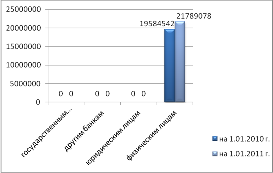 При рассмотрении результатов таблицы 2 можно сделать вывод, что ЗАО «Банк Город» полностью ориентировано на кредитовании физических лиц. Объем выданных кредитов за 2009 год составил 19584542 тыс. руб., за год эта статья увеличилась на 2204536 тыс. руб. (темп прироста составил 10%) и на 1 января 2011 года составила 21789078 тыс. руб. Более наглядно эти данные представлены на диаграмме (Рис. 2.1.).
