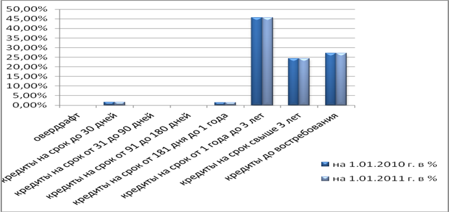 Кредитов, предоставляемые при недостатке средств на расчетном (текущем) счете («овердрафт»), сроком от 31 до 90 дней, от 91 до 180 дней у ЗАО «Банк Город» за рассматриваемый период времени не было. Более наглядно данные таблицы 3 можно увидеть на диаграмме (Рис. 2.2.)