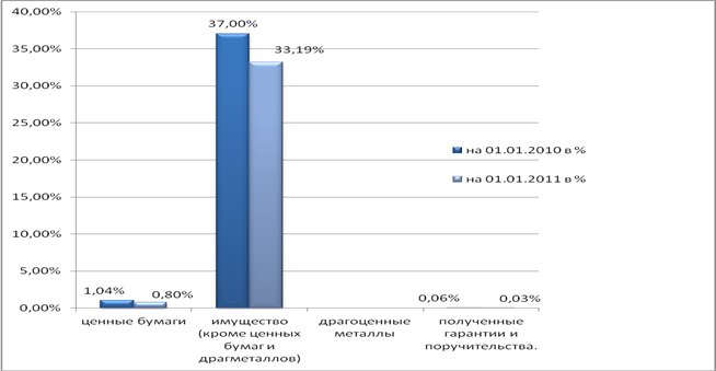 Так же в качестве обеспечения имеются ценные бумаги. В 2009 году их было принято в размере 204 360 тыс. руб., что составило 1,04% от общего объема выданных кредитов. За 2010 год данный вид обеспечения сократился на 30 821 тыс. руб. и составил уже 0,80% от общего объема выданных кредитов. Ценные бумаги следует рассматривать в разрезе эмитентов. В том случае, если в залог приняты ценные бумаги, эмитентом которых являются органы государственной власти или бумаги, относящиеся к категориям «голубых фишек», то банк ЗАО «Банк Город» имеет качественное обеспечение.
