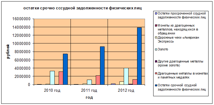 Из анализа видно, что по сравнению с 2010 годом активы в 2011 году уменьшились на 1,3 млн. рублей или на 9,02%, зато активы 2012 года увеличились на 7,4 млн. рублей или на 58% по сравнению с 2011. Анализ остатка срочной ссудной задолженности свидетельствует о том, что в конце 2011 по сравнению с 2010 годом увеличилась на 1,8 млн. рублей или на 24,48%, а в конце 2012 года объем ссудной задолженности физических лиц возрос на 150,1% и составил 13866482 тыс. рублей. Данное ежегодное увеличение объясняется высоким спросом на такой вид банковского продукта, как кредит среди населения региона.