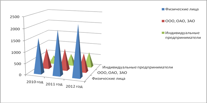 Из анализа субъектов кредитования видно, что доля кредитования физических лиц в общем объеме кредитов, выдаваемых филиалом "Первомайский" ОТП Банка, в 2010 году составляет 1560 тысяч рублей, удельный вес составляет 0,55% из общей доли кредитов. По сравнению с 2010 годом в 2011 году доля кредитования физических лиц увеличивается на 411 тысяч рублей, то есть на 0,02%. За 2012 – 2011 год сумма кредитования физических лиц увеличилась на 286 тысяч рублей. Доля кредитования ООО, ЗАО И ОАО с годами уменьшается, если в 2010 году она составляла 0,32%, в 2011 году – 0,28, то в 2012 году – 0,22. Зато доля кредитования индивидуальных предпринимателей увеличивается, по сравнению с 2010 годом в 2012 году произошло увеличение на 0,03%. Можно сделать вывод, что субъекты как ООО, ЗАО И ОАО, и индивидуальные предприниматели начали приобретать одинаковое доверие и платежеспособность, так как удельный вес в группе с годами равняется.