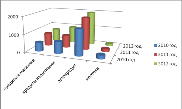 Анализ видов предоставляемых кредитов за 2010 – 2012 года, в млн. рублей