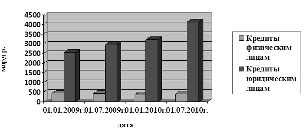 Как свидетельствуют данные таблицы 2.2, основной удельный вес клиентского кредитного портфеля приходится на кредитные вложения юридическим лицам ― 90,8%. Абсолютная сумма таких кредитов по состоянию на 1 июля 2010г., составила 4132,0 млрд р., т.е. увеличение задолженности юридических лиц за анализируемый период составило 1557,7 млрд р. Темп прироста данной статьи на 01.07.2010г. составил 60,5 %, что обусловило увеличение удельного веса данной статьи по сравнению с началом 2009 года на 5,6 процентных пункта. Таким образом, увеличение объемов кредитования обеспечивалось за счет корпоративного сектора.