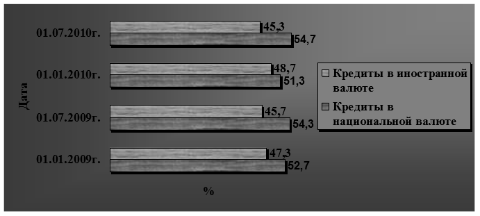 В целом сумма кредитов в национальной валюте за анализируемый период увеличилась на 895,4 млрд р. Темп прироста составил 56,2%, что обусловило увеличение доли данной статьи в клиентском кредитном портфеле на 2 процентных пункта. Что касается кредитов в иностранной валюте, то их объем увеличился на 631,0 млрд р., но доля данной статьи за анализируемый период в общей сумме кредитных вложений снизилась на 2 процентных пункта. Таким образом, на 01.07.2010г. наибольший объем кредитных вложений в клиентском кредитном портфеле осуществлен в национальной валюте, которые в абсолютном выражении составили 2488,0 млрд р.