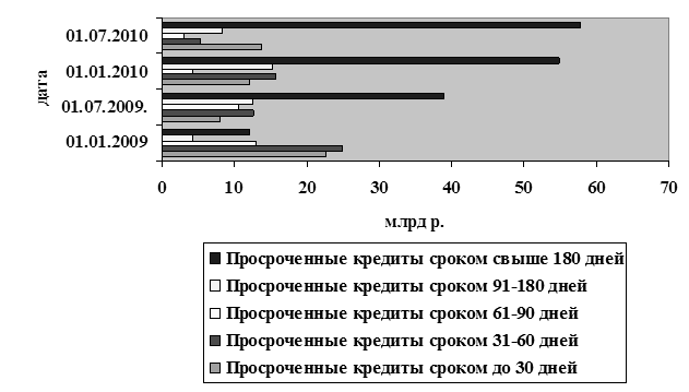 Рисунок 2.7 - Состав и структура просроченных кредитов ОАО "БПС-Банк" в разрезе сроков, млрд р.