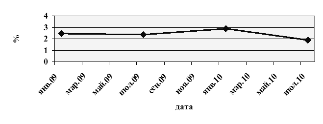Рисунок 2.8 - Динамика доли просроченных кредитов в клиентском кредитном портфеле ОАО "БПС-Банк", %