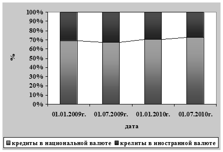 Из рисунка 3.3 видно, что динамика удельного веса кредитных вложений в разрезе валют неравномерна. Наименьшая доля кредитных вложений в национальной валюте наблюдается на 01.07.2010г. и составляет 67,4 процентных пункта, а наибольший удельный вес – на 01.07.2010г., что в относительном выражении составило 72,8 процентных пункта.