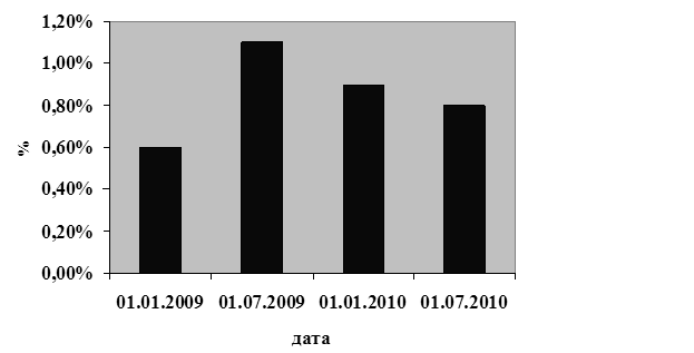 Как видно из приведенных данных таблицы 3.5, удельный вес проблемных кредитов в общем объеме кредитных вложений незначителен, однако за анализируемый период он увеличился на 0,2 процентных пункта и составил 598,1 млрд р. Темп прироста при этом составил 113,2 процентных пункта. Для наглядности рассмотрим динамику доли проблемных кредитов в общем объеме кредитных вложений с помощью рисунка 3.5.