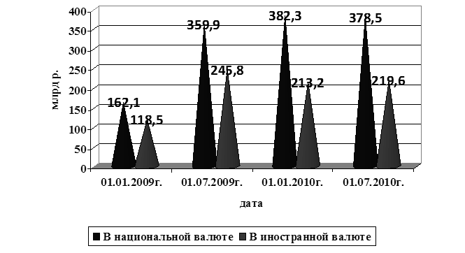 Как видно из рисунка, в структуре проблемных кредитов на протяжении всего анализируемого периода преобладают кредиты в национальной валюте. На начало 2010г. данная статья достигает наибольшего объема и составляет 382,3 млрд р. Наибольший объем проблемных кредитов в иностранной валюте наблюдается на 01.07.2009г. В целом за анализируемый период сумма проблемных кредитов увеличилась за счет кредитов в национальной валюте на 216.4 млрд р. и кредитов в иностранной валюте на 101,1 млрд р. Рассмотрим динамику проблемных кредитов в разрезе видов деятельности с помощью таблицы 3.7.